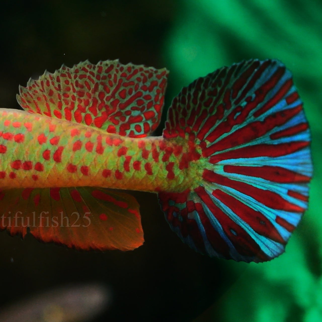 緑・黄色・赤・青・オレンジと非常にカラフルで、はっきりくっきり色の乗った放射状の尾びれが特徴的です。