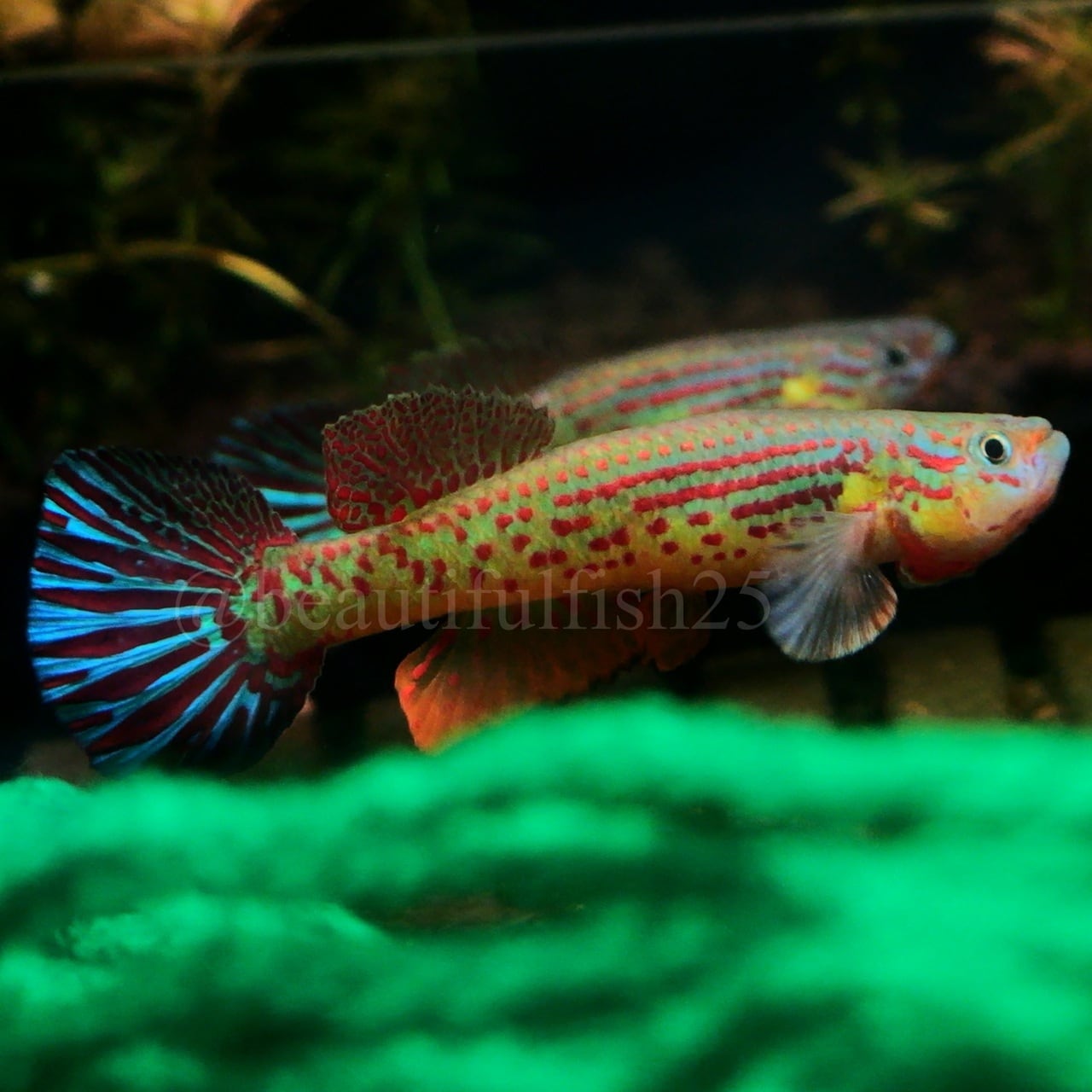 緑・黄色・赤・青・オレンジと非常にカラフルで、はっきりくっきり色の乗った放射状の尾びれが特徴的です。